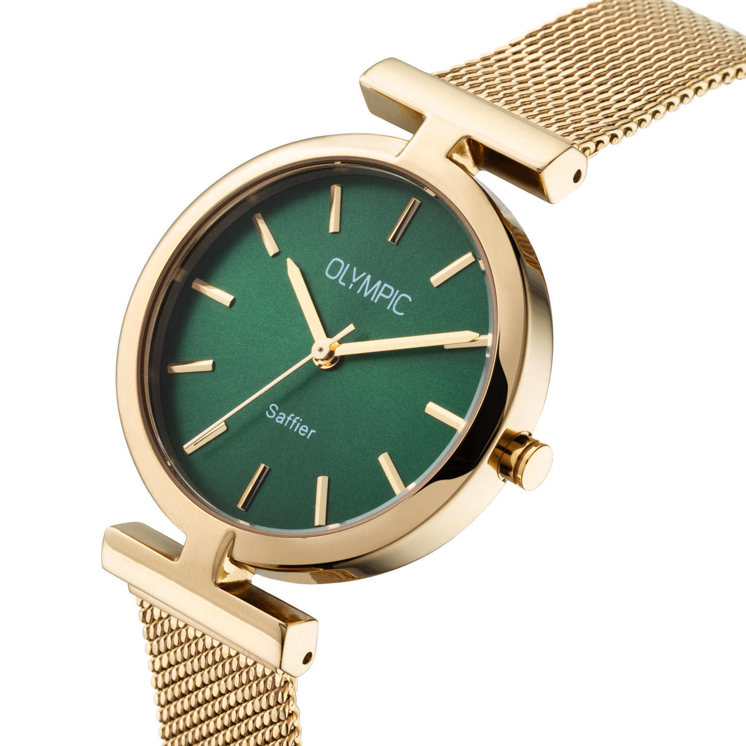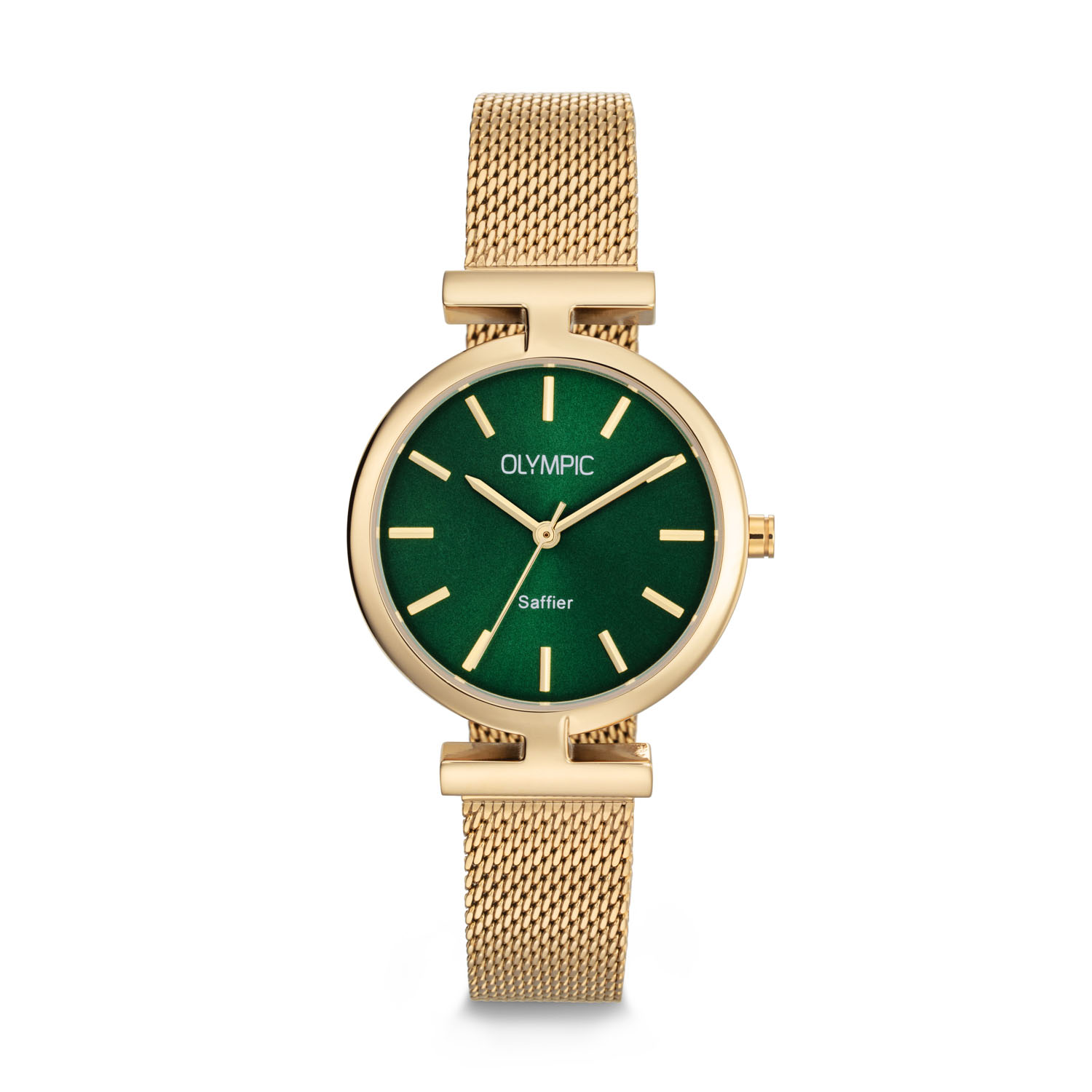 Dit unieke Olympic horloge met artikelnummer: OL90DDD001 is een chique dameshorloge. Het horloge heeft een stalen goudkleurige kast met een speciale vaste band aanzet en een groene wijzerplaat met fijne wijzers en strepen. Aan de kast zit een goudkleurige mesh band  met een kliksluiting. Tevens ontvang je bij dit horloge een zwarte lerenband. Beide banden hebben een easy click systeem en zijn dus gemakkelijk zelf om te wisselen. Het horloge heeft een saffierglas, een doorsnee van 35mm en is 5ATM.