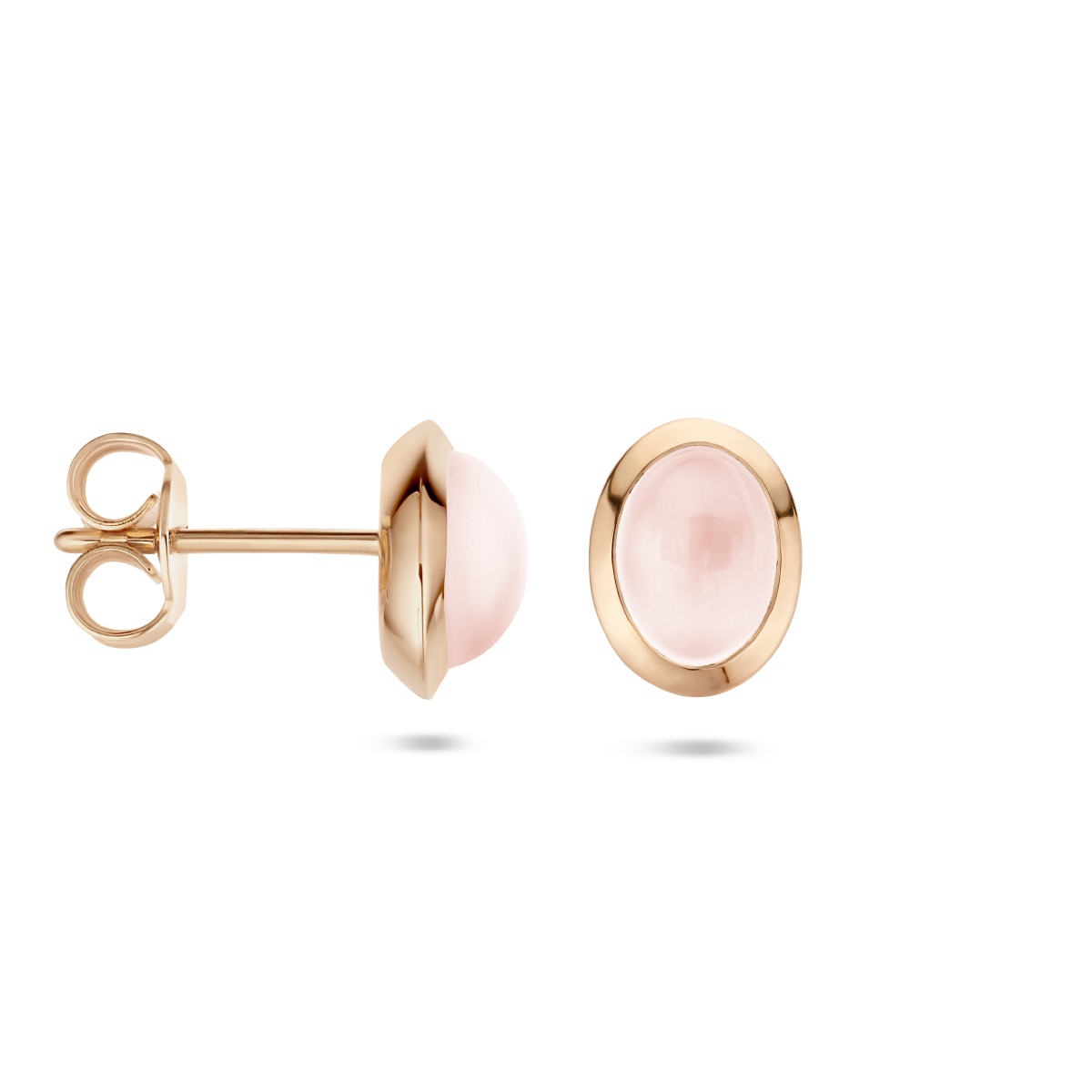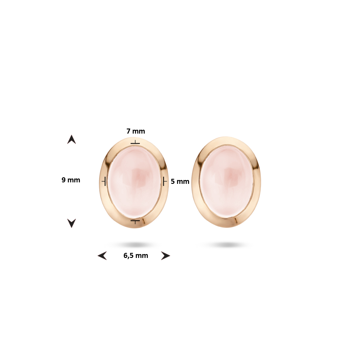 14k Rosegouden oorknoppen uitgevoerd met schitterende roze kwarts. De oorknoppen hebben een afmeting van 9x6.5mm.