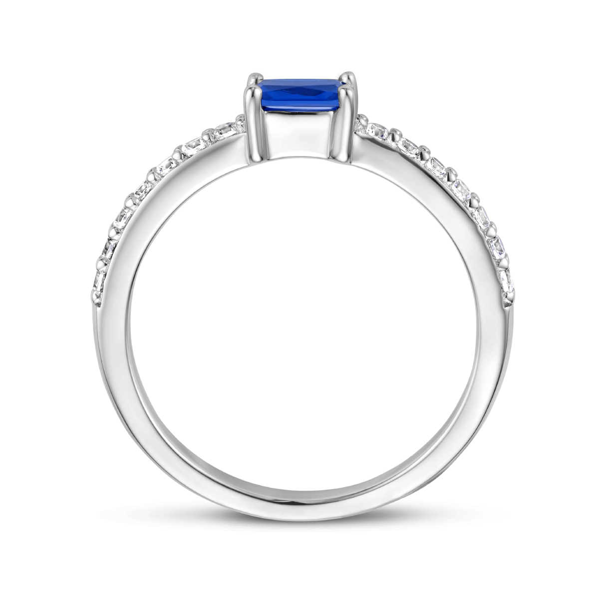 Gerhodineerd zilveren ring uitgevoerd met schitterend blauw en wit zirkonia. De ring heeft een breedte van 4mm.