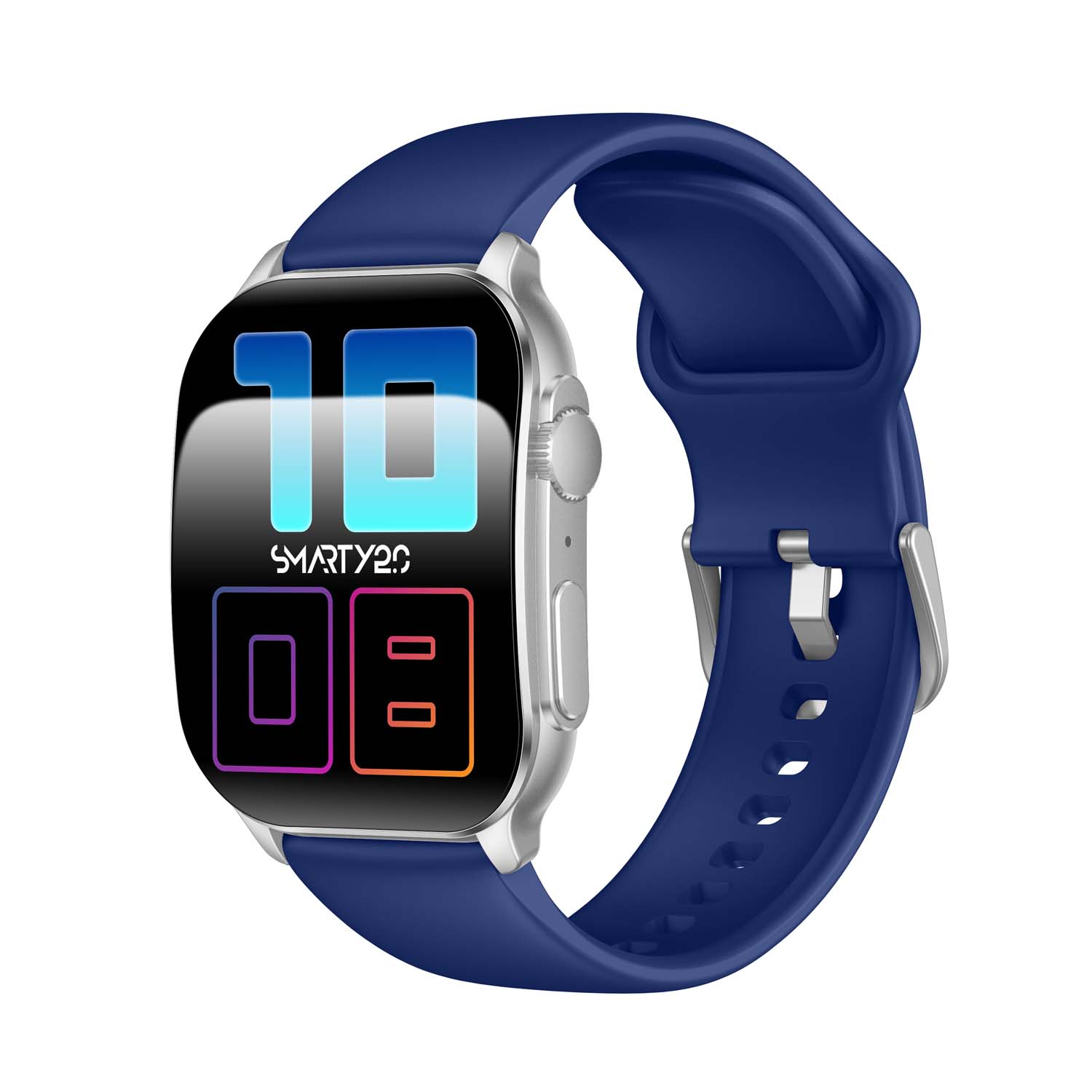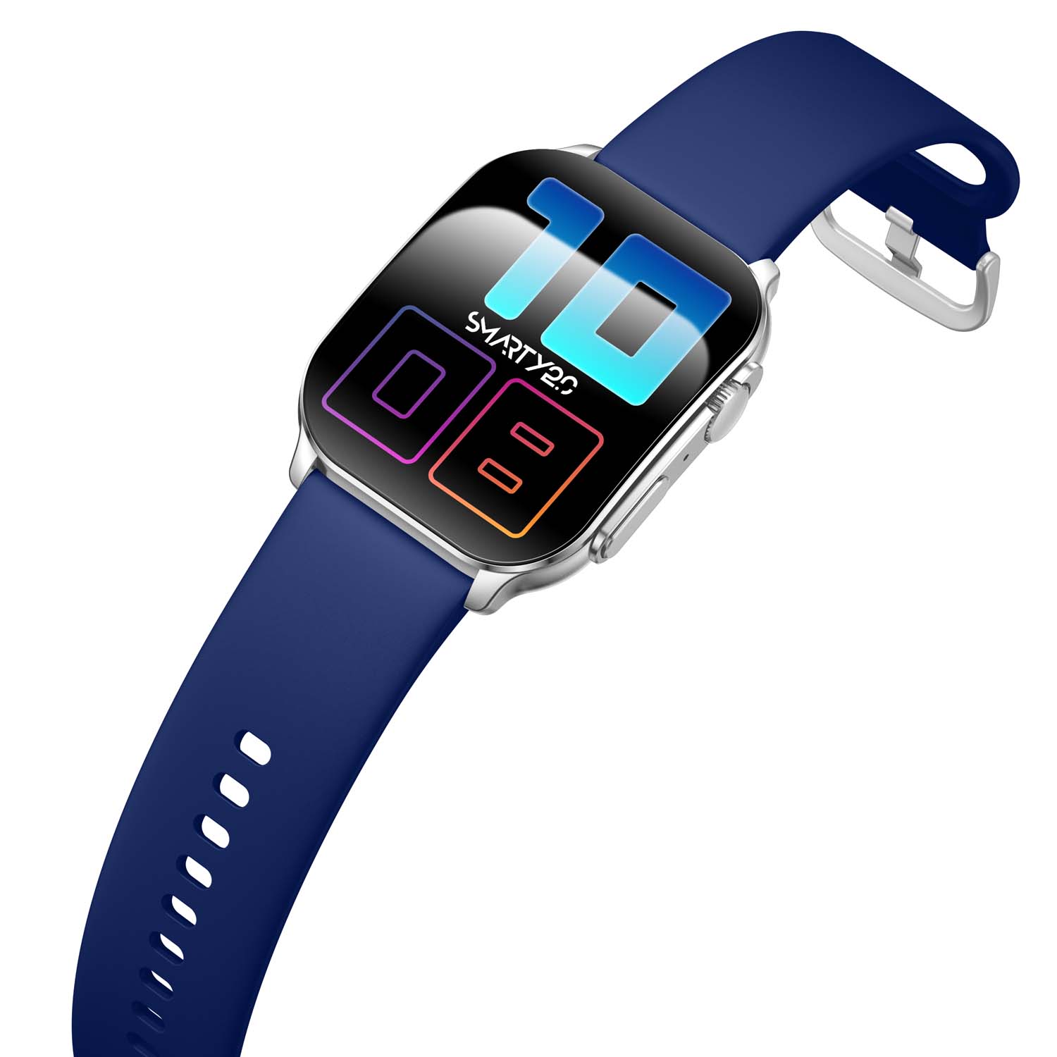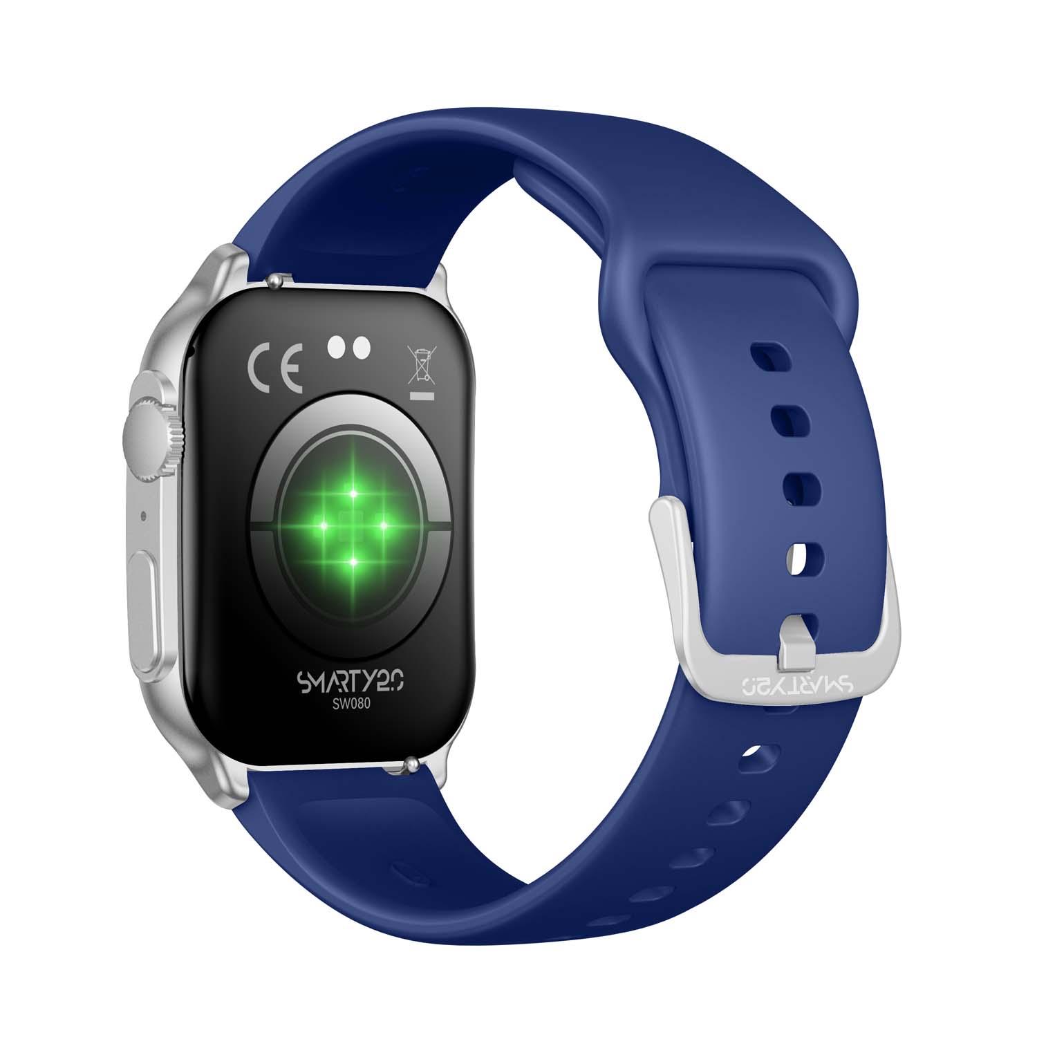 Dit Smarty Smartwatch horloge met nr: SW080D is een stap in de toekomst. De zilverkleurige kast is gemaakt van metaal met een gehard glas. Aan de kast zit een blauwe siliconen band met een gespsluiting. Het rechthoekige horloge heeft een afmeting van 46x37mm en is spatwaterdicht. Bij deze uitvoering krijg je een extra aparte blauwe siliconen band kado. Deze smartwatch is sportief, stijlvol, maar zeker gebruiksvriendelijk. Om door apps, berichten en tekst te bladeren hoeft je alleen maar op het glas te tikken of de knop te gebruiken.